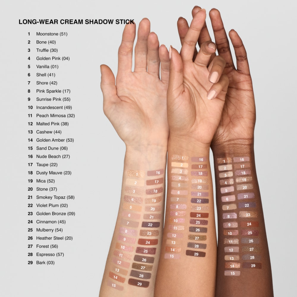 Long-Wear Cream Eyeshadow Stick Ingredients: Methyl Trimethicone, Trimethylsiloxysilicate, Synthetic Wax, Lauroyl Lysine, Polymethylsilsesquioxane, Stearoxymethicone/Dimethicone Copolymer, Octyldodecanol, Silica, Synthetic Fluorphlogopite, Caprylic/Capric Triglyceride, Polyglyceryl-3 Polyricinoleate, Copernicia Cerifera (Carnauba) Wax\ Copernicia Cerifera Cera \Cire De Carnauba, Polyhydroxystearic Acid, Polyethylene, Microcrystalline Wax\Cera Microcristallina\Cire Microcristalline, Isostearic Acid, Dicalcium Phosphate, Lecithin, Disteardimonium Hectorite, Propylene Carbonate, Calcium Aluminum Borosilicate, Calcium Sodium Borosilicate, Tin Oxide, Pentaerythrityl Tetra-Di-T-Butyl Hydroxyhydrocinnamate, [+/- Mica, Titanium Dioxide (Ci 77891), Iron Oxides (Ci 77491), Iron Oxides (Ci 77492), Iron Oxides (Ci 77499), Ultramarines (Ci 77007), Blue 1 Lake (Ci 42090), Chromium Oxide Greens (Ci 77288), Chromium Hydroxide Green (Ci 77289), Yellow 5 Lake (Ci 19140), Ferric Ferrocyanide (Ci 77510), Carmine (Ci 75470), Copper Powder (Ci 77400), Bismuth Oxychloride (Ci 77163), Ferric Ammonium Ferrocyanide (Ci 77510), Aluminum Powder (Ci 77000), Manganese Violet (Ci 77742), Bronze Powder (Ci 77400)]
