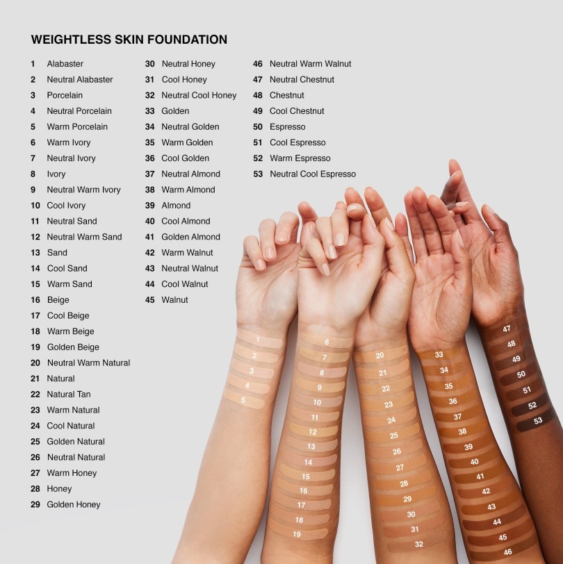 Weightless Skin Foundation SPF 15 Ingredients: Octinoxate 6.7%, Titanium Dioxide 1.6%Ingredients: Water\Aqua\Eau, Dimethicone, Glycerin, Trimethylsiloxysilicate, Cetyl Peg/Ppg10/1 Dimethicone, Butylene Glycol, Polymethylsilsesquioxane, Polyglyceryl3 Diisostearate, Sodium Chloride, Acetyl Glucosamine, Disteardimonium Hectorite, Laminaria Saccharina Extract, Lavandula Angustifolia (Lavender) Oil, Lavandula Hybrida Oil, Honey Extract\Mel\Extrait De Miel, Butyl Avocadate, Caprylyl Glycol, Disodium Stearoyl Glutamate, Sodium Hyaluronate, Salicylic Acid, Methoxy Amodimethicone/Silsesquioxane Copolymer, Aluminum Hydroxide, Silica, Pentaerythrityl TetraDiTButyl Hydroxyhydrocinnamate, Polysilicone11, Citric Acid, Sodium Hydroxide, Hexylene Glycol, Stearic Acid, Linalool, Linalyl Acetate, Bht, Tocopheryl Acetate, Disodium Edta, Phenoxyethanol, [+/ Mica, Titanium Dioxide (Ci 77891), Iron Oxides (Ci 77491), Iron Oxides (Ci 77492), Iron Oxides (Ci 77499)]