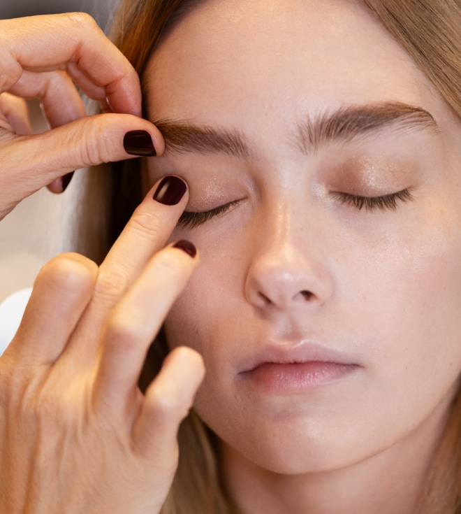 is complemented by softly smudged eyeliner and a glossy, tinted lip.