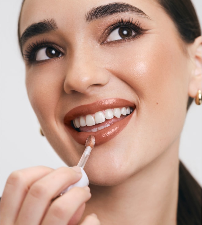 Layer Extra Plump Lip Serum in Bare Cocoa over lip color to add a tinted shine.