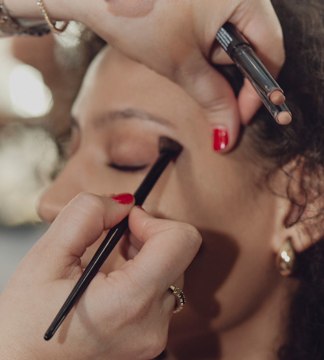 Use a brush to buff Long-Wear Cream Shadow Stick in Taupe over lid. Build wing at corner of eye with Long-Wear Cream Shadow Stick in Cinnamon.