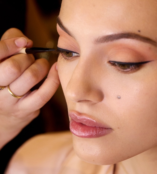 Build wing at corner of eye with Long-Wear Gel Eyeliner in Black Ink and work inward for precise line.